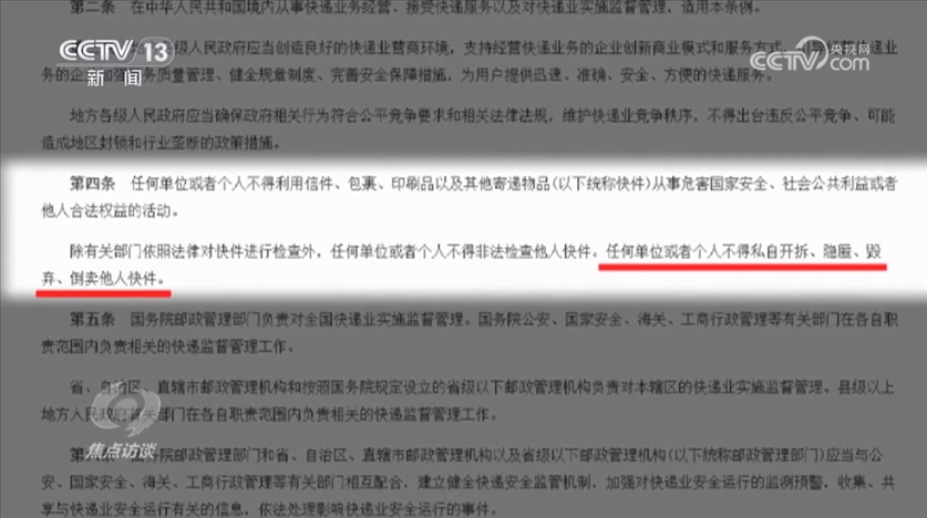 國(guó)務(wù)院頒布的《快遞暫行條例》第四條明確規(guī)定:“任何單位或者個(gè)人不得私自開拆、隱匿、毀棄、倒賣他人快件。”