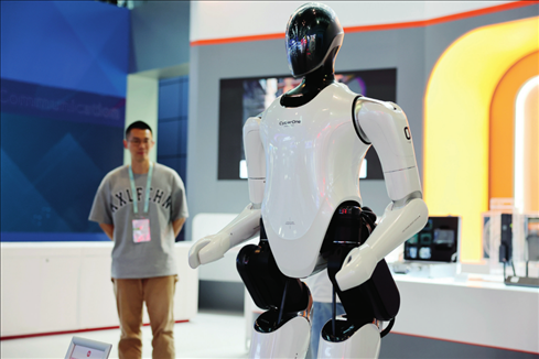 位于中關村國家自主創(chuàng)新示范區(qū)展示中心的一款全尺寸人形仿生機器人(2023 年 5 月 26 日攝)張晨霖攝 / 本刊