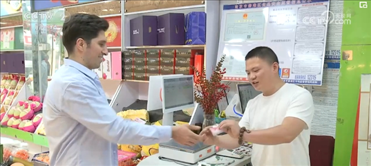 蔡恩還展示了一次現(xiàn)金購(gòu)物的過(guò)程。他在ATM機(jī)用外卡取現(xiàn)后,來(lái)到水果店挑了一些水果,價(jià)值88元人民幣,他支付一張百元整鈔,店主拿出前期銀行上門兌換的“零錢包”,順利找零12元。