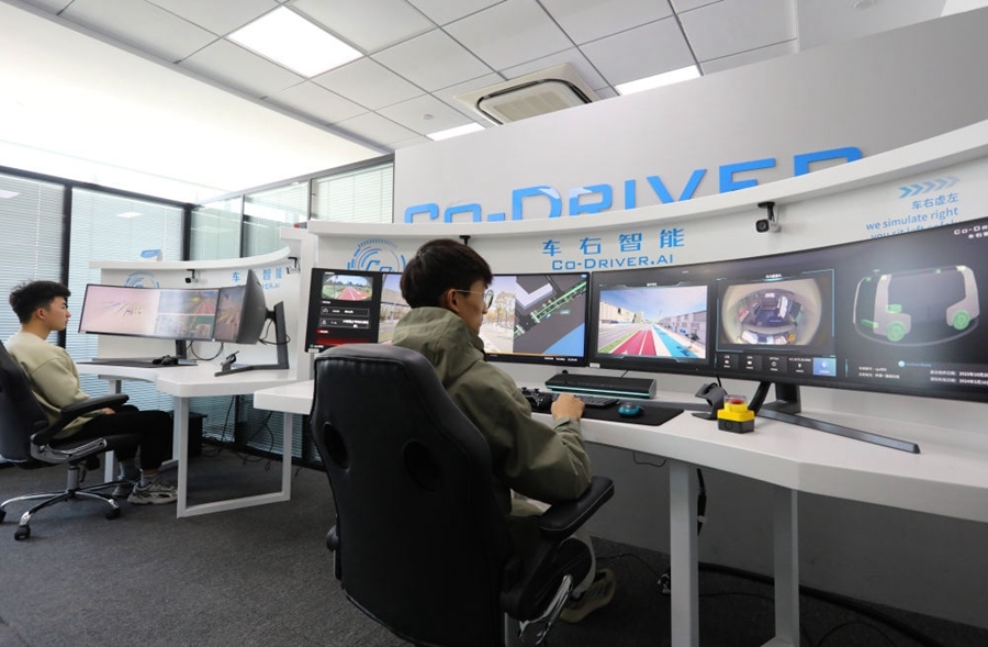 在位于中國(guó)(上海)自由貿(mào)易試驗(yàn)區(qū)臨港新片區(qū)的一家智能駕駛企業(yè),工作人員通過(guò)無(wú)人駕駛汽車遠(yuǎn)程監(jiān)管平臺(tái)的實(shí)時(shí)畫面,結(jié)合電子地圖對(duì)在自動(dòng)駕駛測(cè)試專用路上行駛的車輛進(jìn)行監(jiān)管(2024年4月9日攝)。