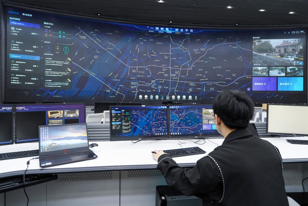 工作人員在江蘇省南京市城市運(yùn)行管理中心指揮大廳操作“一網(wǎng)統(tǒng)管”指揮調(diào)度系統(tǒng)(2024年4月11日攝)。近年來(lái),南京市積極構(gòu)建數(shù)字化、智能化、智慧化城市治理體系,將城市運(yùn)行“一網(wǎng)統(tǒng)管”作為推進(jìn)城市數(shù)字化轉(zhuǎn)型、城市治理體系和治理能力現(xiàn)代化的重要工作。