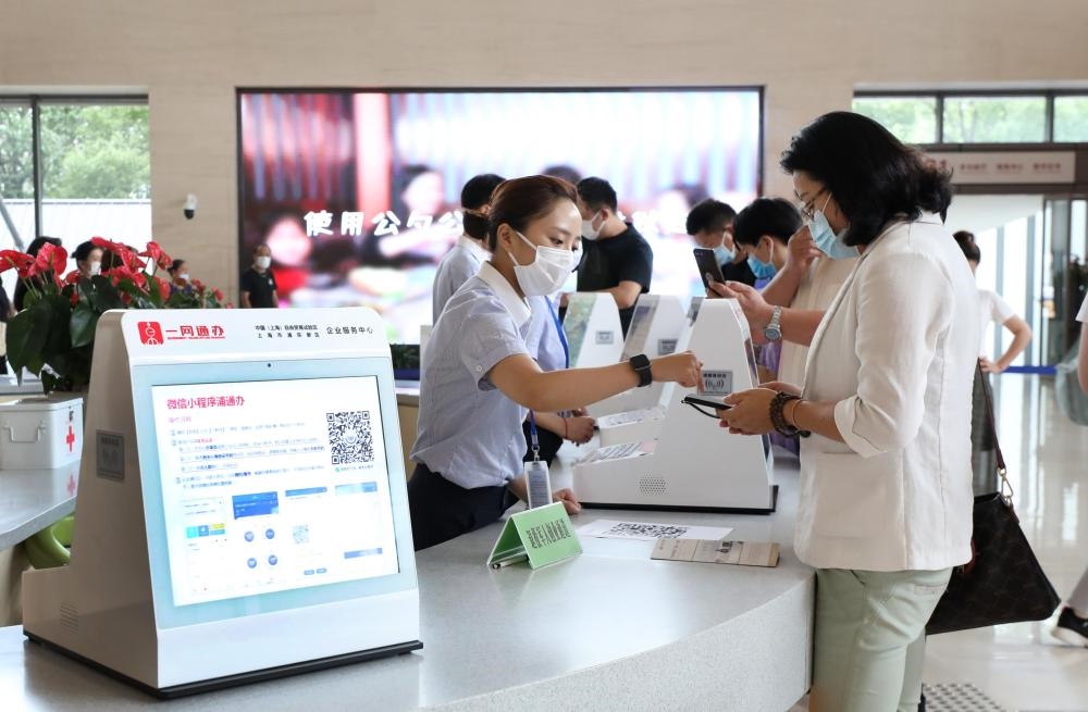 上海市浦東新區(qū)2019年率先啟動(dòng)“一業(yè)一證”改革。這是在浦東新區(qū)企業(yè)服務(wù)中心辦事大廳,工作人員指導(dǎo)市民通過(guò)手機(jī)小程序辦理一網(wǎng)通辦業(yè)務(wù)(2020年8月4日攝)。