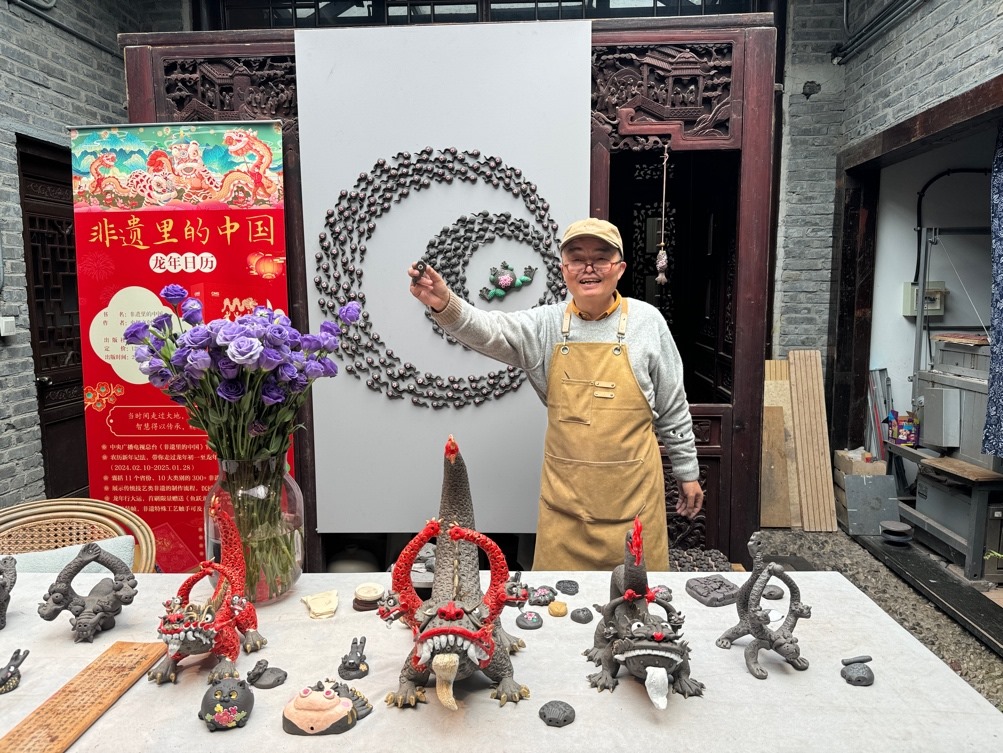 江蘇省非物質文化遺產(chǎn)泥塑傳承人周寶康展示他的泥塑作品“太平泥叫叫”