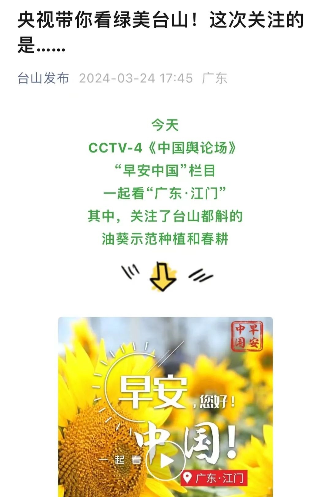 “央視帶你看綠美臺(tái)山,這次關(guān)注的是......”“就在明早7點(diǎn)!央視奉上重慶大足人文美景,向全球觀眾道早安!”“央視聚焦!徐州,有美景,有年味”“金葵向陽(yáng)開,中春好景和風(fēng)裁!美麗江門與您相遇央視《早安中國(guó)》”……越來(lái)越多的地方政府伸出橄欖枝,希望《早安中國(guó)》多“來(lái)”當(dāng)?shù)匾挥[好風(fēng)光。