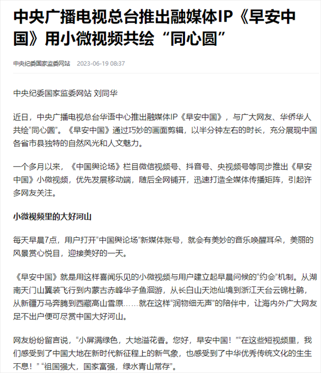 “早安中國(guó)切口新穎,有文化屬性和微記錄的氣質(zhì)。”“每次片尾的結(jié)語(yǔ)字幕,都是從哪里選的?每天,都給我學(xué)習(xí)的機(jī)會(huì)?!薄皩I(yè)微記錄是媒體融合最寬廣的路?!薄对绨仓袊?guó)》真真切切地緩解了許多海內(nèi)外網(wǎng)友的故土思鄉(xiāng)情切,也收到了來(lái)自四面八方的認(rèn)可及反饋?!吨袊?guó)輿論場(chǎng)》節(jié)目持續(xù)發(fā)出“游子看故鄉(xiāng)”征集令,請(qǐng)海外華僑華人說(shuō)出對(duì)家鄉(xiāng)的思念和心中最想“打卡”的祖國(guó)美景。