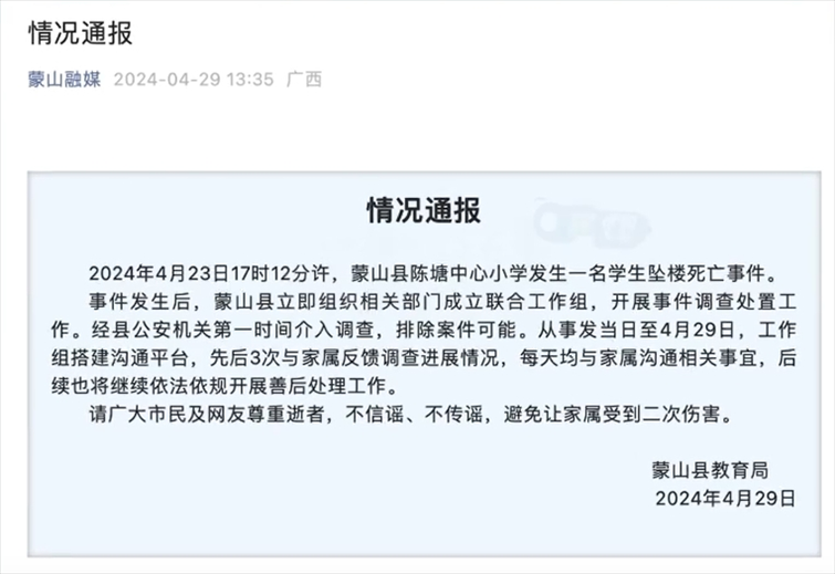 ·廣西蒙山一小學(xué)生墜樓死亡,公安機關(guān)排除案件可能。