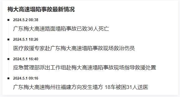 據(jù)廣東梅州大埔縣委宣傳部消息,5月1日凌晨2時10分許,梅大高速往福建方向K11+900m附近發(fā)生高速公路路面塌陷事故。至5月2日早上5時30分,已發(fā)現(xiàn)23輛車陷落,36人死亡,30人受傷(無生命危險)。