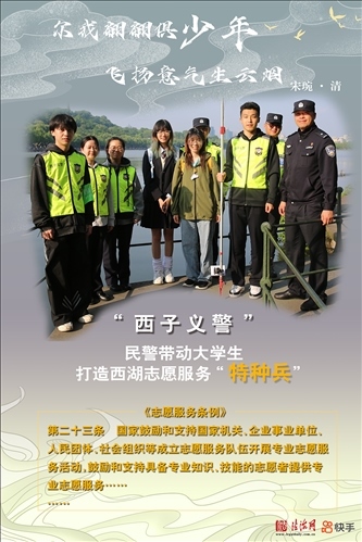浙江省杭州市公安局西湖風(fēng)景名勝區(qū)分局組織公安巡特警、消防、交警、行政執(zhí)法、平安志愿者等各方力量參與社會治理工作,逐漸壯大的“西子義警”隊(duì)伍已成為西湖邊守望平安的重要力量。近期,一群朝氣蓬勃的青年大學(xué)生加入“西子義警”隊(duì)伍,共同營造更加和諧的西湖景區(qū)平安環(huán)境。