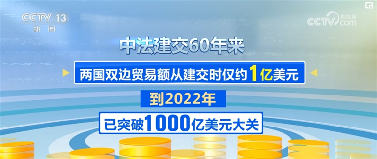中法建交60年來,兩國雙邊貿(mào)易額從建交時僅約1億美元,到2022年已突破1000億美元大關(guān)。如今,法國是中國在歐盟內(nèi)第三大貿(mào)易伙伴和第三大實(shí)際投資來源國,中國則是法國在亞洲第一大貿(mào)易伙伴。