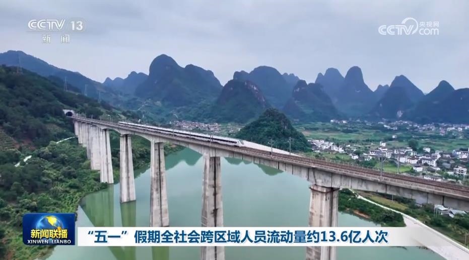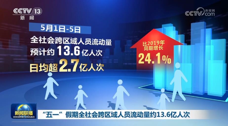 初步統(tǒng)計顯示,5月1日—5日,全社會跨區(qū)域人員流動量預計約13.6億人次,日均超2.7億人次,比2019年同期增長24.1%。
