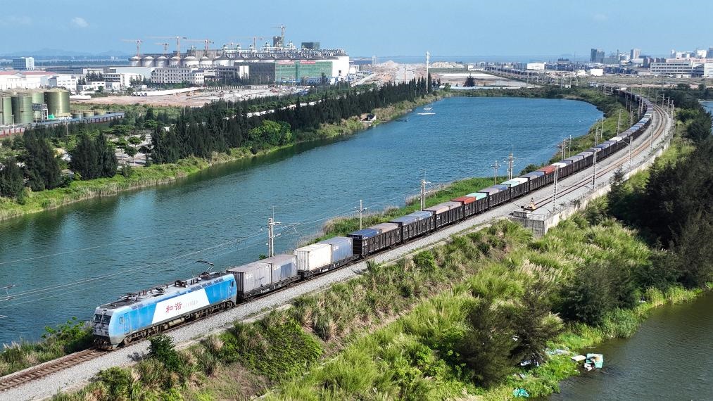 圖為一趟滿載貨物的西部陸海新通道鐵海聯(lián)運班列從欽州港東站駛出(無人機照片)。新華社記者 張愛林 攝