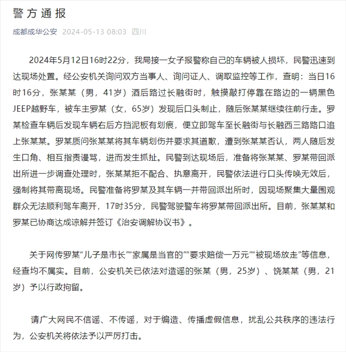 ·女子要求“觸摸”其車男子賠1萬并叫囂“兒子是市長”?成都警方:均不屬實(shí),造謠者已被行拘。