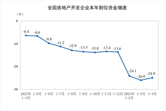 1—4月份,房地產(chǎn)開發(fā)企業(yè)到位資金34036億元,同比下降24.9%。其中,國內(nèi)貸款5583億元,下降10.1%;利用外資9億元,下降46.7%;自籌資金11736億元,下降10.1%;定金及預(yù)收款10002億元,下降37.2%;個人按揭貸款4953億元,下降39.7%。