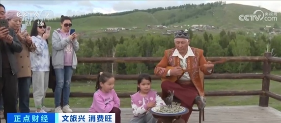 這位哈薩克族老人正在表演的木偶山羊舞是阿勒泰地區(qū)級(jí)非物質(zhì)文化遺產(chǎn),木偶山羊身上的線繩與老人的手指相連,隨著音樂(lè)的節(jié)奏,山羊翩翩起舞。這樣的表演吸引了不少游客前來(lái)欣賞。