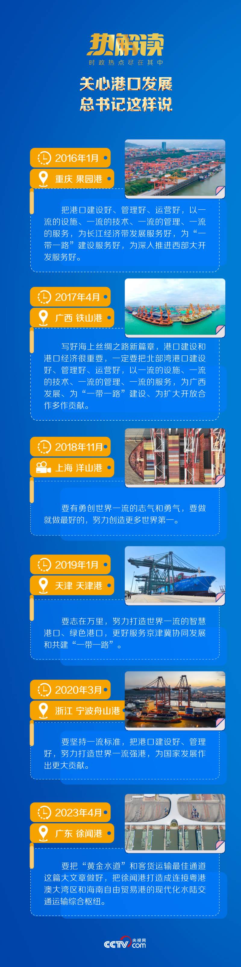 從內河航運的黃金水道到國際航運的港通四海,總書記多次在考察行程中關注我國沿海沿江港口建設,精心謀劃推進世界一流強港建設工作。