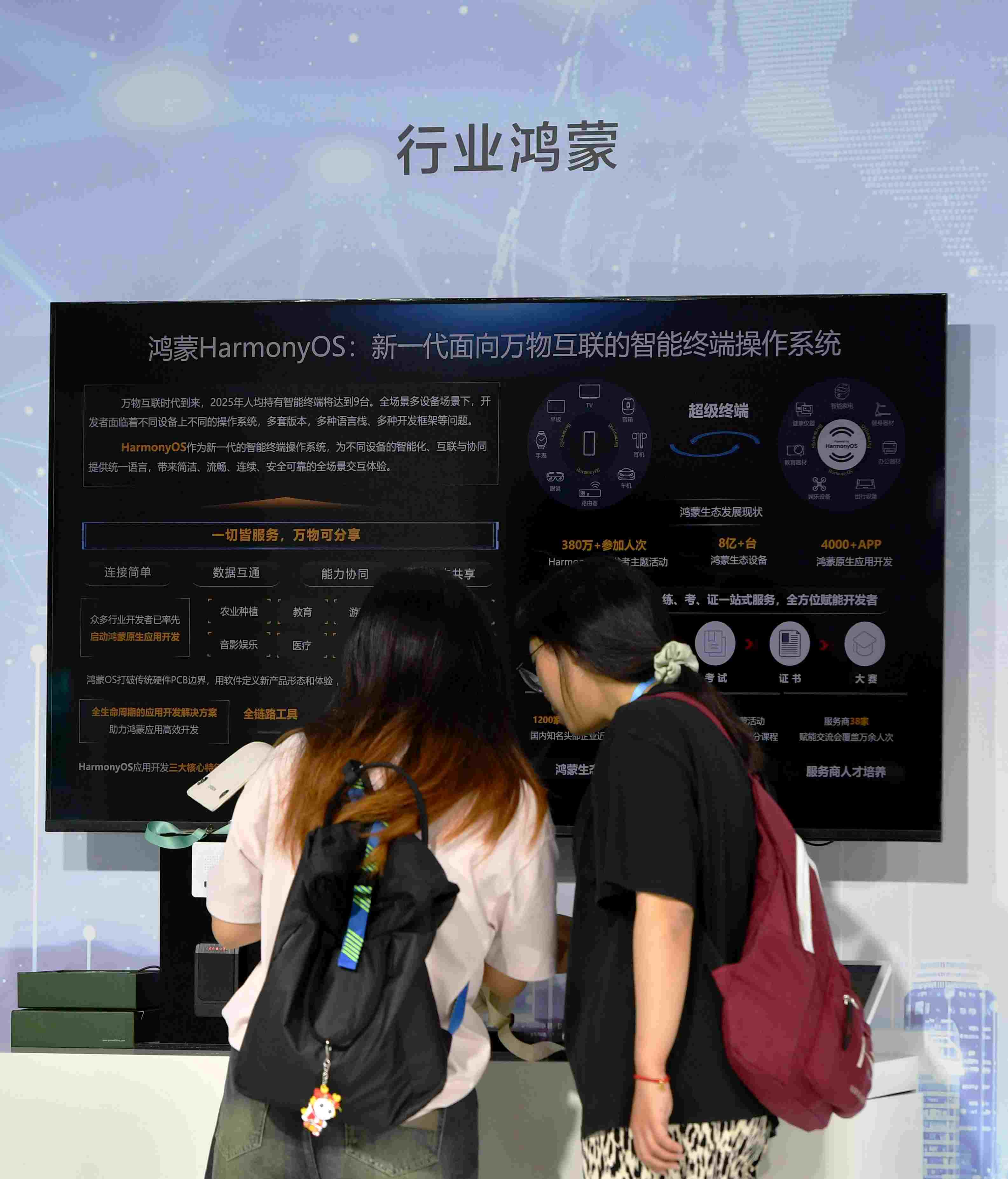 在現(xiàn)場(chǎng)體驗(yàn)區(qū),兩名觀(guān)眾在體驗(yàn)鴻蒙智能終端系統(tǒng)。新華社記者魏培全 攝