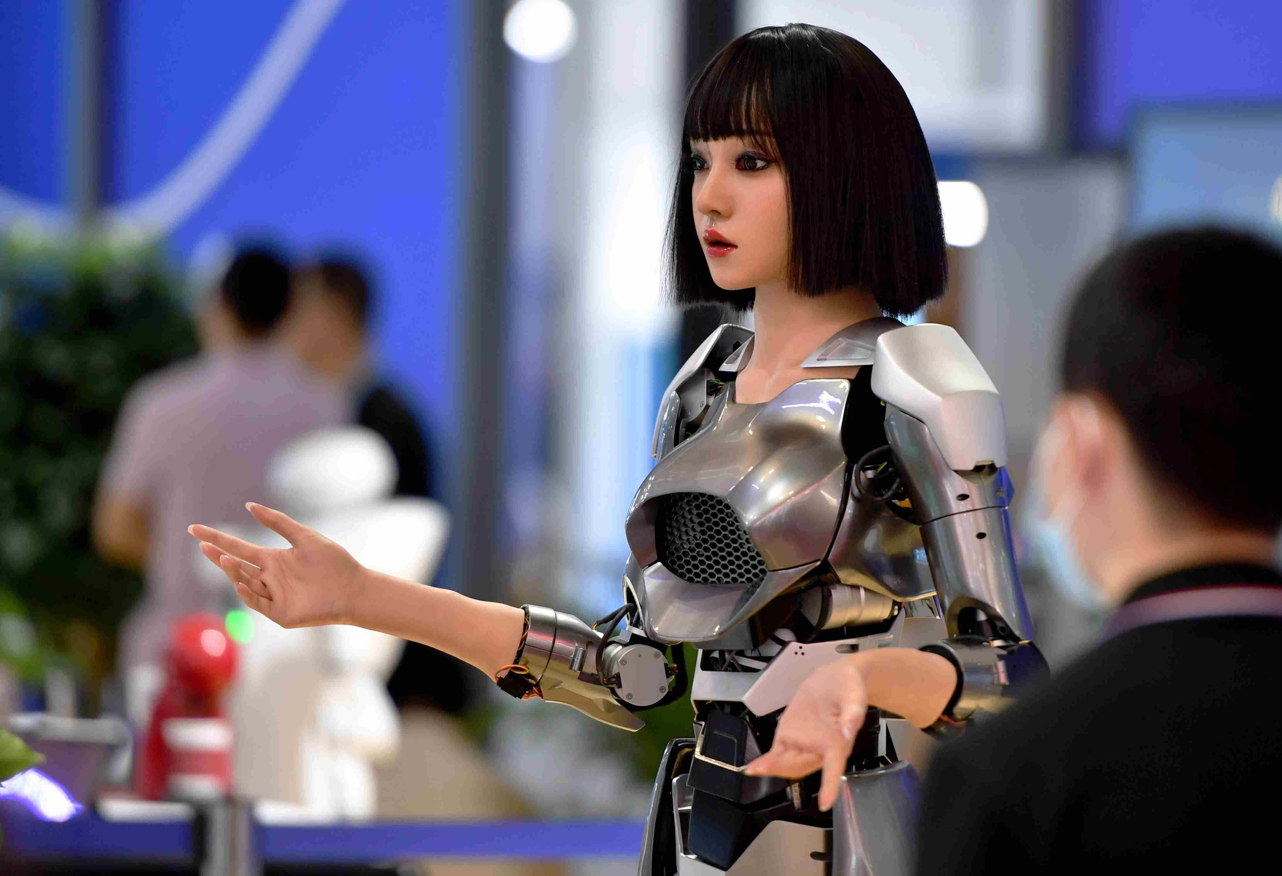 在現(xiàn)場(chǎng)體驗(yàn)區(qū),超仿生人形機(jī)器人“小柒”在向觀(guān)眾致意。 新華社記者魏培全 攝