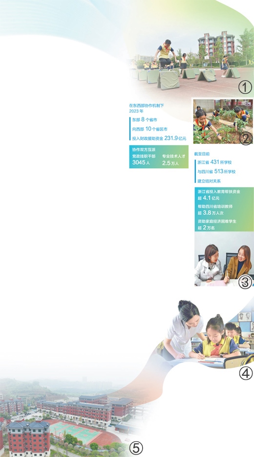 圖①:孩子們?cè)谏象w育課。人民網(wǎng)記者 王 波攝 圖②:孩子們?cè)谏蟿趧?dòng)課。圖③:之江小學(xué)教師(右)在浙江交流學(xué)習(xí)。受訪者供圖 圖④:老師在為五年級(jí)一班的孩子輔導(dǎo)作業(yè)。圖⑤:之江小學(xué)校園。圖②④⑤均為本報(bào)記者宋豪新攝數(shù)據(jù)來源:農(nóng)業(yè)農(nóng)村部、浙江省教育廳、四川省教育廳