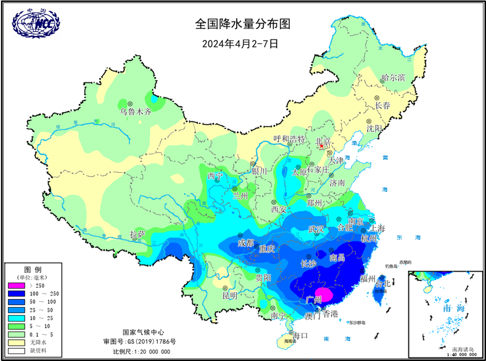 14次區(qū)域暴雨過程襲擊我國,較常年同期明顯偏多。春季,我國共發(fā)生14次區(qū)域暴雨過程,較常年同期偏多3.8次。4月2-7日的暴雨過程為1961年以來同期第八強,受其影響,我國華東南部、華中南部、華南東部及貴州東北部、重慶、四川中東部等地累計降水量50~100毫米,浙江西南部、福建、江西南部、湖南東南部、廣東大部等地累計降水量100~250毫米,局地超過250毫米(圖5);湖南茶陵(203.2毫米)、廣東始興(145.3毫米)日降水量超過極端閾值。