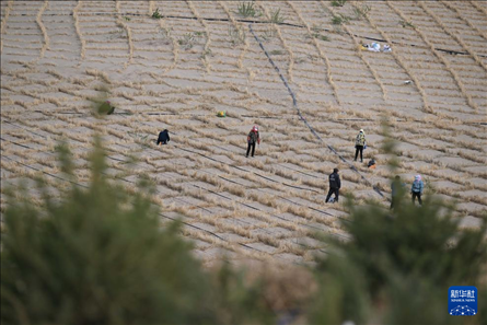 在內(nèi)蒙古赤峰市翁牛特旗巴彥呼交嘎查其白線防沙治沙項(xiàng)目區(qū),治沙工人在拉滴灌帶。新華社記者 連振 攝