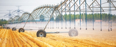 6月17日,在山東省東營市廣饒縣李鵲鎮(zhèn)前艾家村的田地里,農(nóng)民正在使用桁架式噴灌機澆地。劉云杰攝(人民視覺)