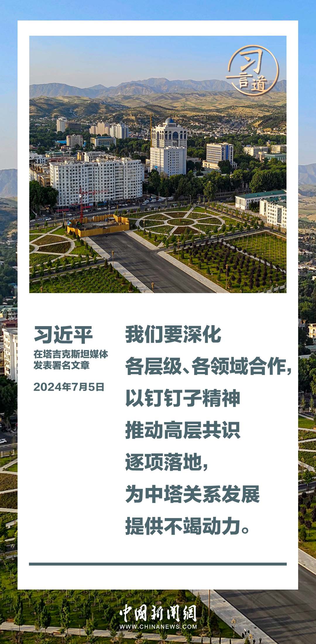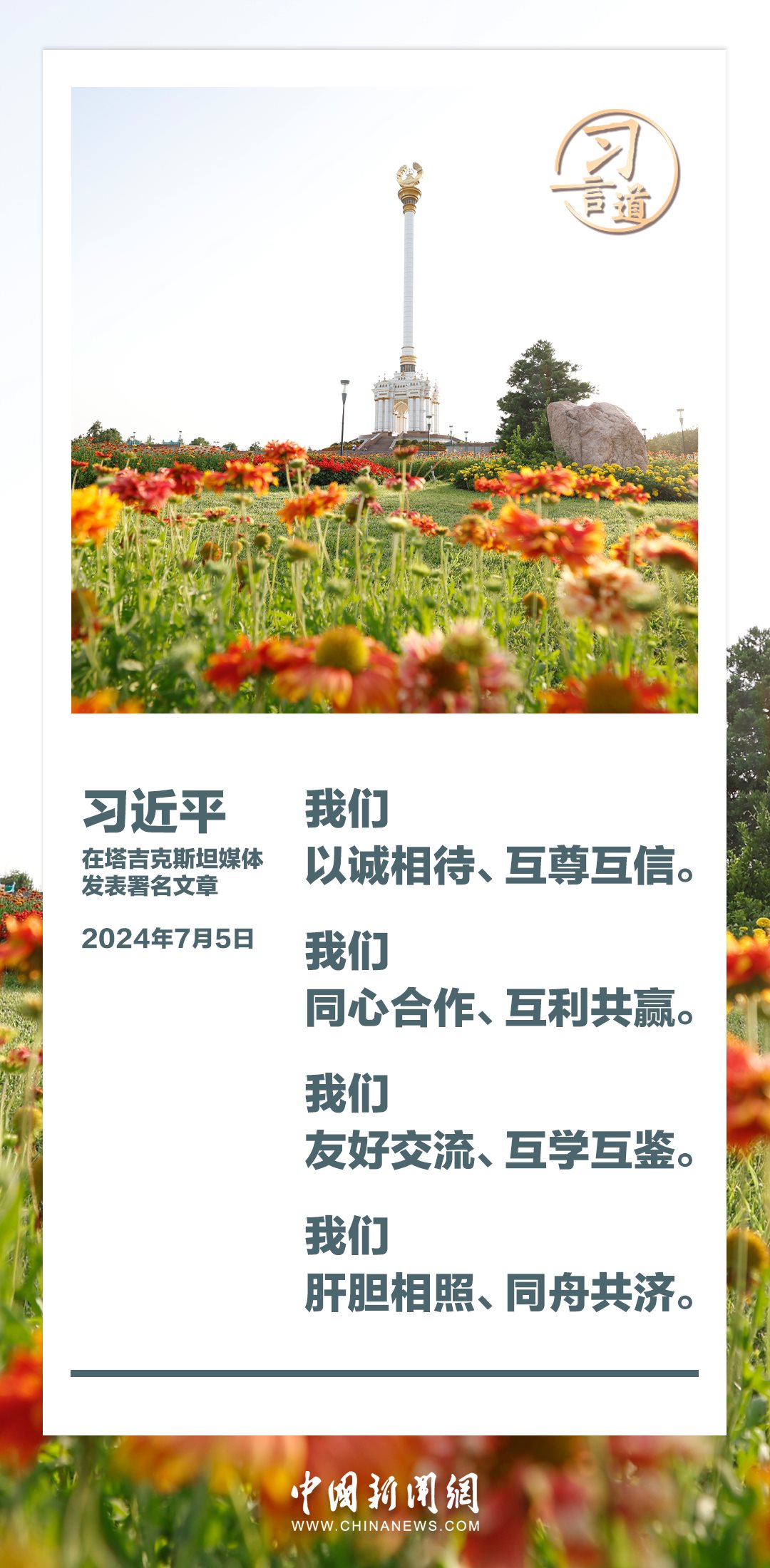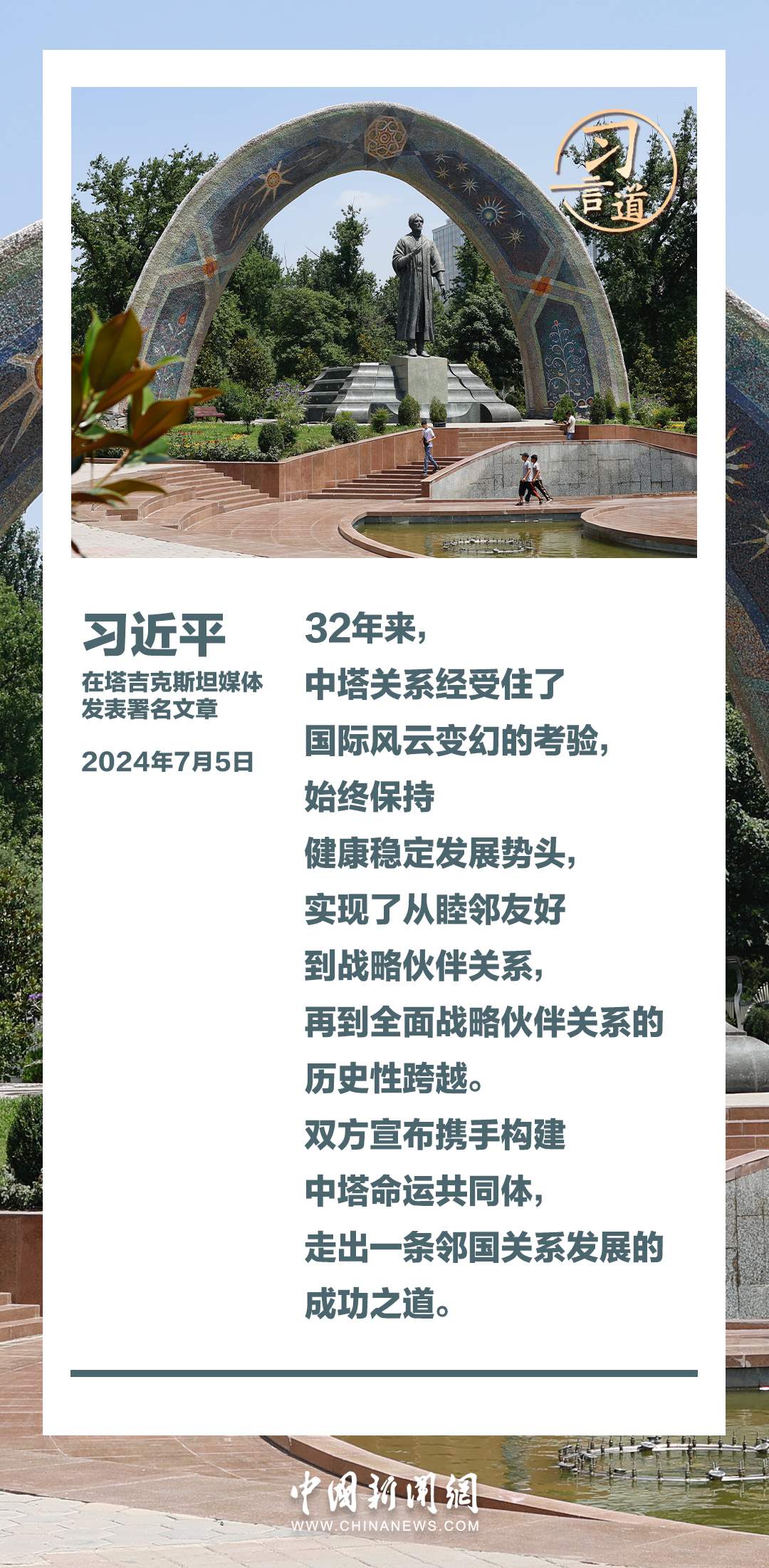 7月5日,在對(duì)塔吉克斯坦進(jìn)行國(guó)事訪問(wèn)之際,國(guó)家主席習(xí)近平在塔吉克斯坦《人民報(bào)》和“霍瓦爾”國(guó)家通訊社發(fā)表題為《共創(chuàng)中塔關(guān)系美好明天》的署名文章。習(xí)近平指出——