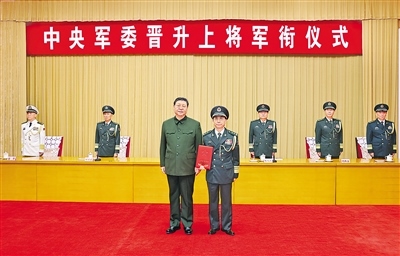 下午4時許,晉銜儀式在莊嚴的中華人民共和國國歌聲中開始。中央軍委副主席張又俠宣讀了中央軍委主席習近平簽署的晉升上將軍銜命令。中央軍委副主席何衛(wèi)東主持晉銜儀式。