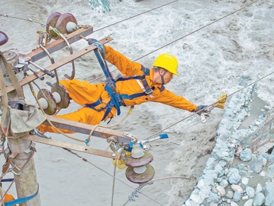 在四川省綿陽(yáng)市平武縣,國(guó)網(wǎng)綿陽(yáng)供電公司黨員突擊隊(duì)隊(duì)員在搶修輸電線(xiàn)路,他的身下就是滔滔洪水。田 海攝(人民視覺(jué))