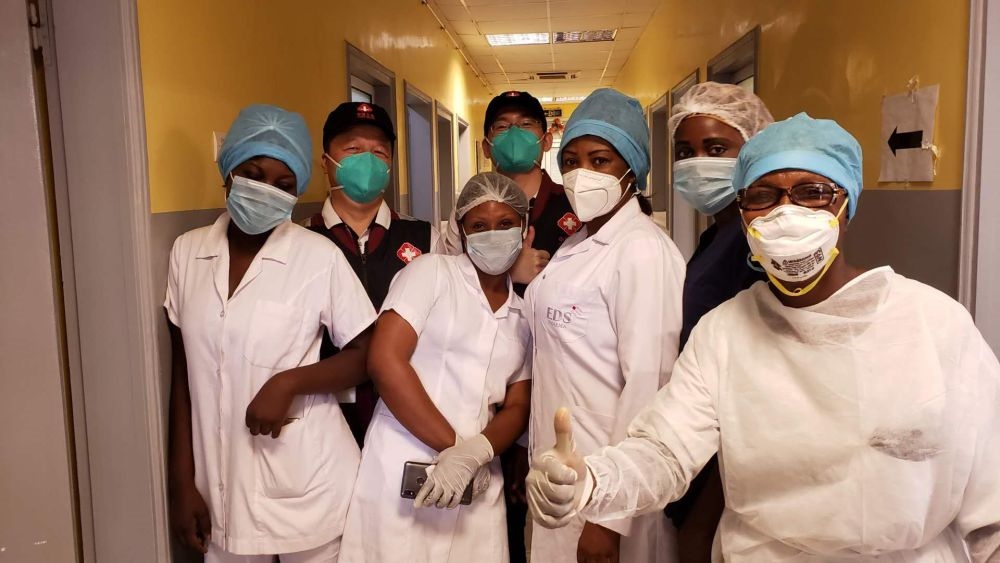 2020年5月26日,在剛果(布)首都布拉柴維爾,中國抗疫醫(yī)療專家組與當?shù)匾痪€醫(yī)務(wù)人員交流,指導(dǎo)新冠肺炎病房建設(shè)。