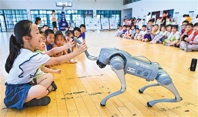 安徽省安慶市科普大篷車巡展活動走進岳西縣菖蒲鎮(zhèn)中心學(xué)校。圖為學(xué)生與機器狗互動。王先國攝(影像中國)