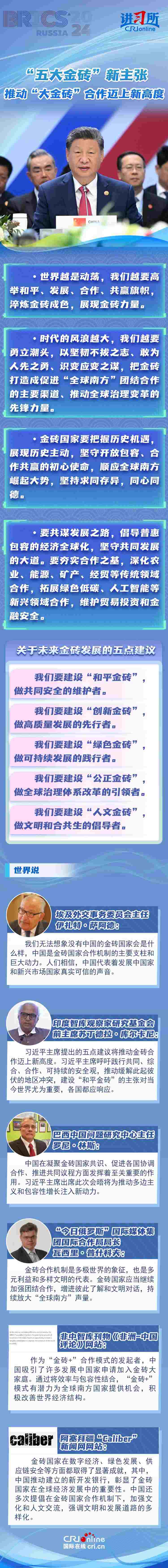 “時代的風(fēng)浪越大,我們越要勇立潮頭,以堅韌不拔之志、敢為人先之勇、識變應(yīng)變之謀,把金磚打造成促進(jìn)‘全球南方’團(tuán)結(jié)合作的主要渠道、推動全球治理變革的先鋒力量。”當(dāng)?shù)貢r間10月23日,習(xí)近平主席在俄羅斯喀山出席金磚國家領(lǐng)導(dǎo)人第十六次會晤并發(fā)表重要講話,提出共建“和平金磚”“創(chuàng)新金磚”“綠色金磚”“公正金磚”“人文金磚”,為“大金磚合作”擘畫藍(lán)圖。