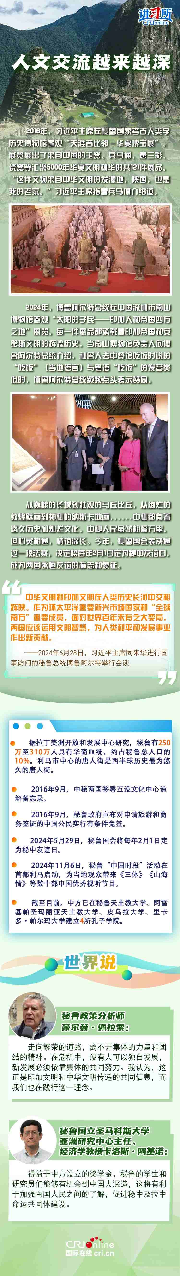 今年6月,博魯阿爾特總統(tǒng)訪華期間,中秘雙方簽署了多項雙邊合作文件,并宣布實質性完成自由貿易協(xié)定升級談判,兩國貿易的便利度和開放度進一步提升。習近平主席強調,中方支持秘魯走符合本國國情的發(fā)展道路,愿同秘方堅定相互支持,堅定不移推進中秘友好合作。
