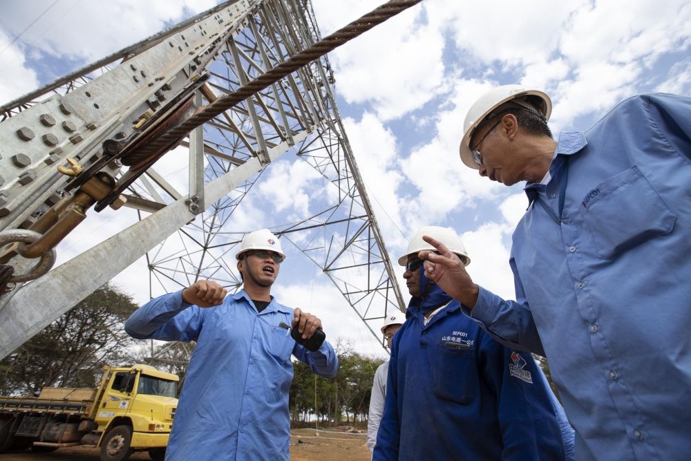 2018年8月7日,在巴西東南部米納斯吉拉斯州阿科斯市附近,巴西美麗山特高壓輸電工程二期第九標(biāo)段項(xiàng)目中方現(xiàn)場(chǎng)施工管理負(fù)責(zé)人(左)在施工現(xiàn)場(chǎng)指導(dǎo)巴方員工。美麗山水電站二期項(xiàng)目是中國(guó)國(guó)家電網(wǎng)公司首個(gè)在海外獨(dú)立投資、建設(shè)和運(yùn)營(yíng)的特高壓直流輸電工程,也是“特高壓+清潔能源”在拉美的示范工程。