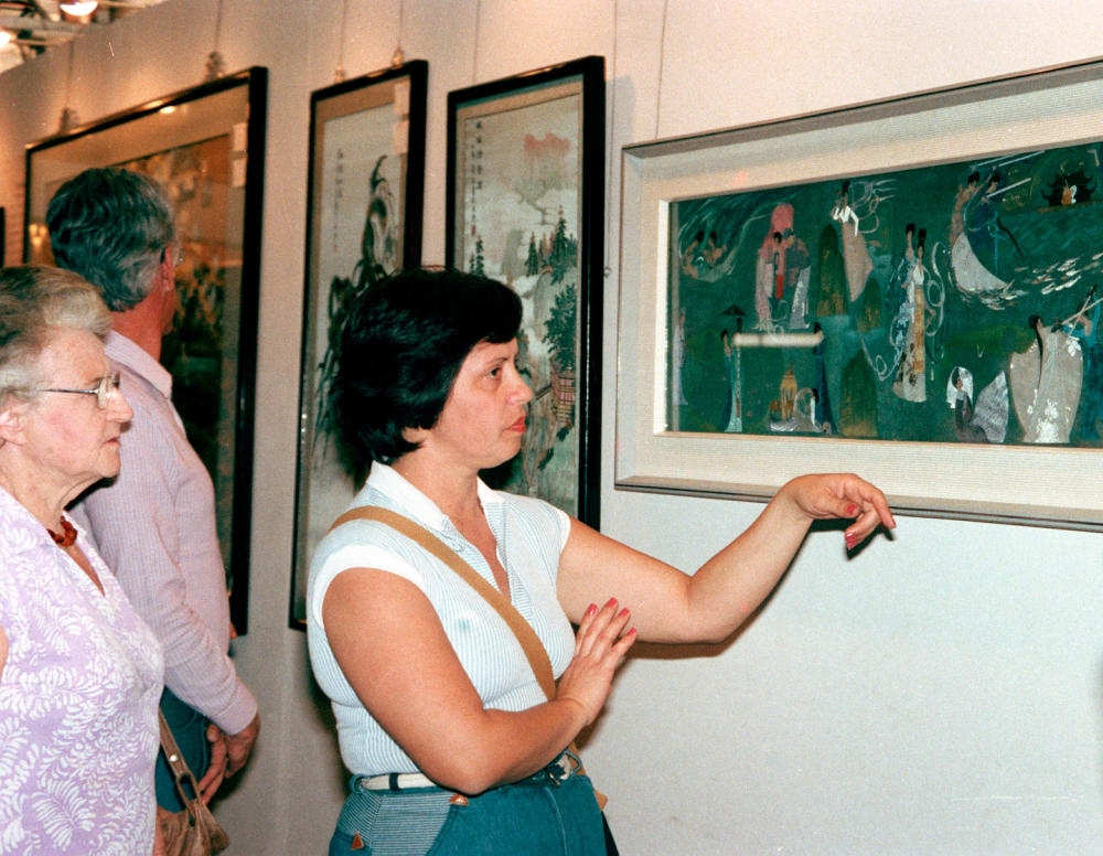1983年5月24日至7月31日,中國(guó)經(jīng)濟(jì)貿(mào)易展覽會(huì)在巴西圣保羅和里約熱內(nèi)盧舉辦。這是巴西觀眾在展覽會(huì)上欣賞貝雕羽毛畫(huà)。