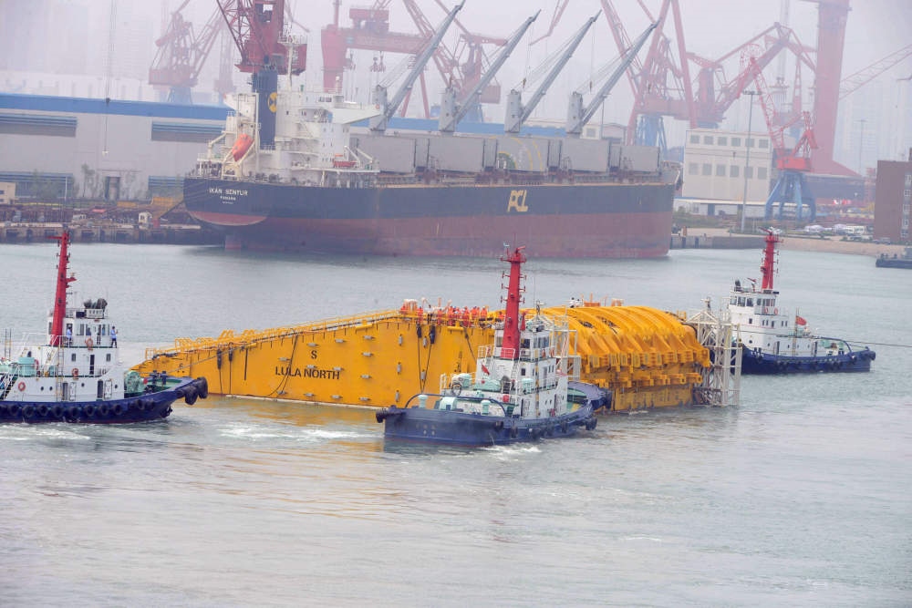 2013年7月15日,出口巴西的深海石油開(kāi)采浮體在拖船牽引下離開(kāi)山東青島港碼頭。這套浮體服務(wù)于巴西近海300公里桑托斯盆地的深海油田。