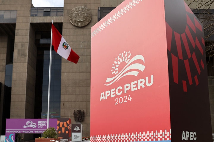 這是2024年11月10日在秘魯首都利馬拍攝的2024年亞太經(jīng)合組織會議標(biāo)識。新華社記者 李木子 攝