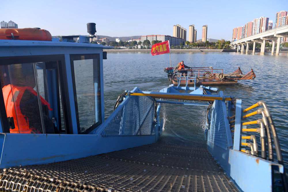 2024年10月28日,清漂員在丹江口水庫(kù)作業(yè)(無(wú)人機(jī)照片)。