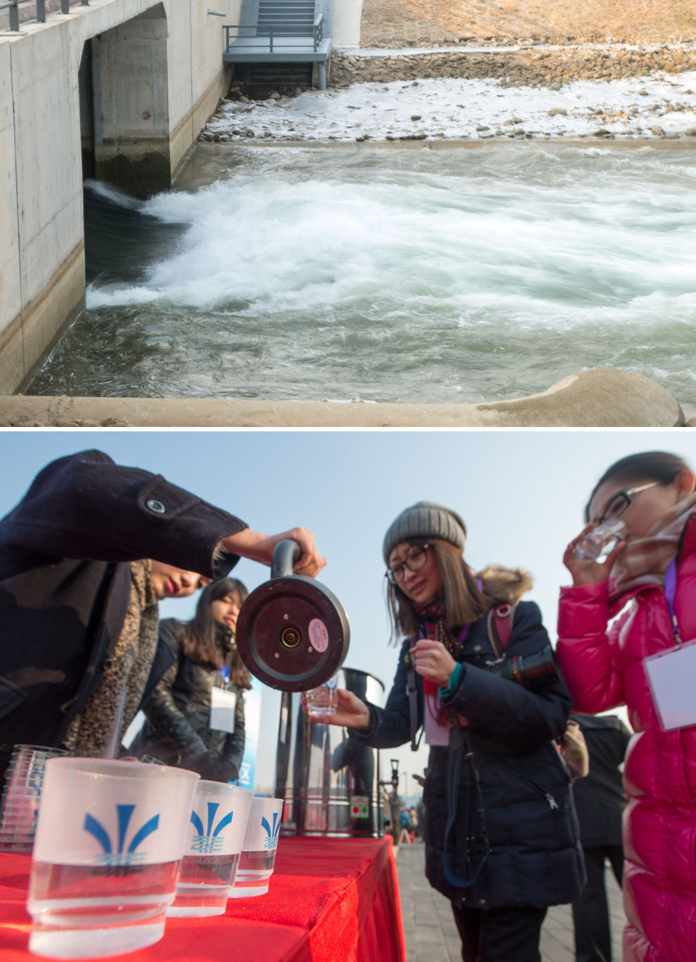 2014年12月27日,南水北調(diào)中線一期工程總干渠終點(diǎn)團(tuán)城湖明渠開閘放水(上圖);參加通水儀式的嘉賓在北京品嘗了來(lái)自丹江口的水(下圖,拼版照片)。