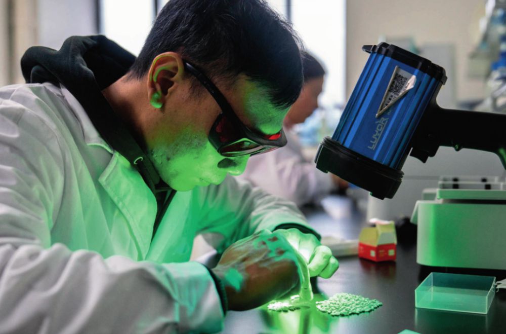 在湖南雜交水稻研究中心,工作人員通過(guò)熒光法進(jìn)行水稻樣本分析(2024年11月25日攝)。陳思汗攝/本刊