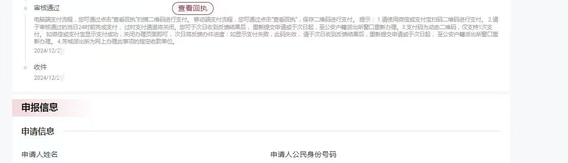 第二步:收到審核通過的短信提示后,使用電腦終端再次登錄北京市政務服務網(wǎng)進入“個人空間--我的辦件”,點擊“查看回執(zhí)”,使用微信或支付寶掃描二維碼進行支付。支付成功后,等待公安機關(guān)制作證件。