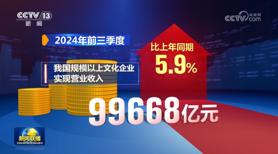 數(shù)據(jù)顯示,今年前三季度,我國(guó)規(guī)模以上文化企業(yè)實(shí)現(xiàn)營(yíng)業(yè)收入99668億元,比上年同期增長(zhǎng)5.9%。其中,文化新業(yè)態(tài)行業(yè)實(shí)現(xiàn)營(yíng)業(yè)收入41616億元,比上年同期增長(zhǎng)10.0%。