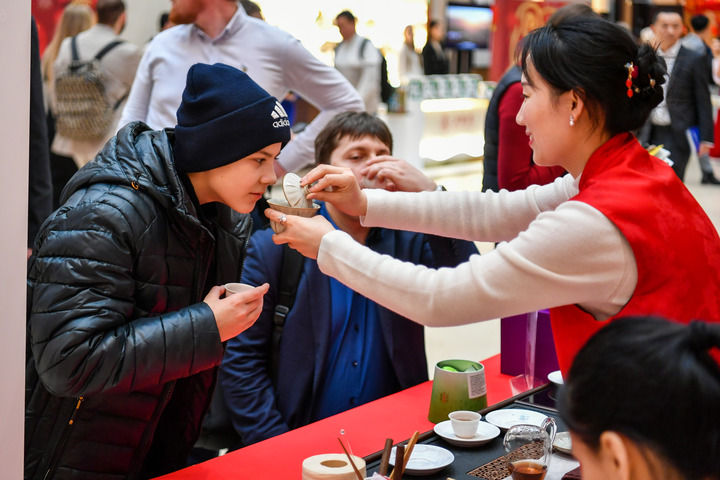 2025年1月28日,在俄羅斯莫斯科舉行的新春廟會(huì)活動(dòng)上,游客在感受茶文化。新華社記者 曹陽 攝