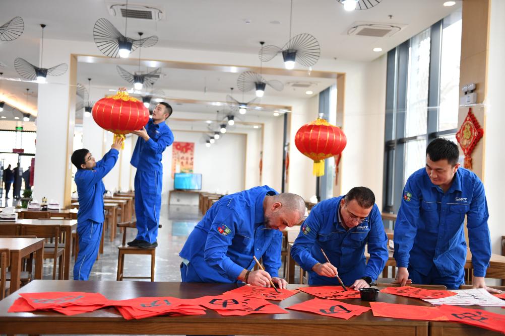 1月23日,在伊拉克米桑油田,中海石油伊拉克有限公司中外員工一起寫(xiě)春聯(lián),掛燈籠。新華社發(fā)