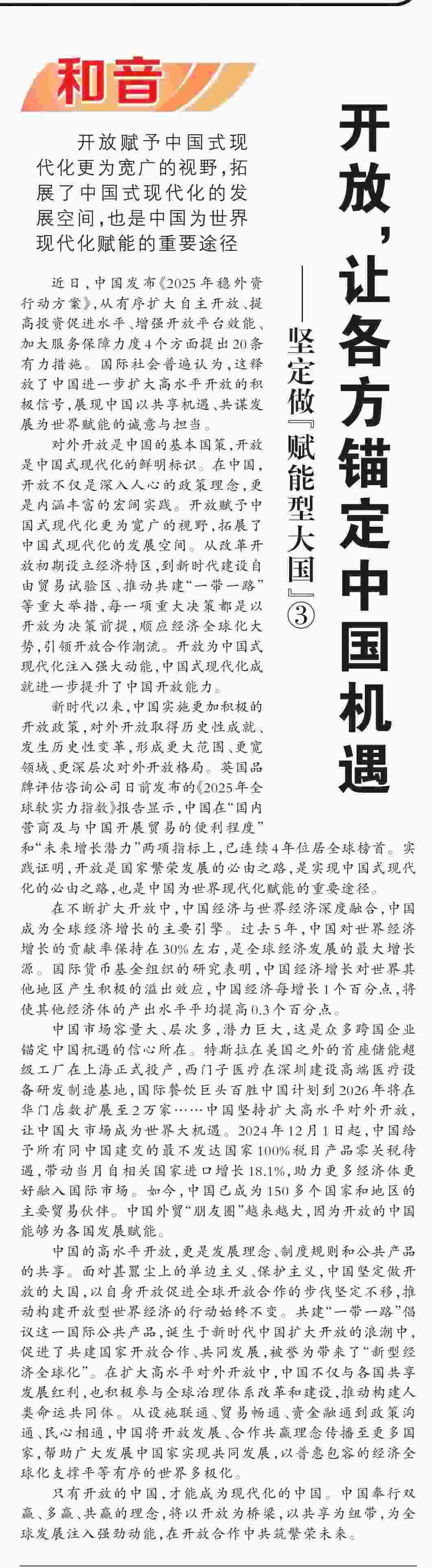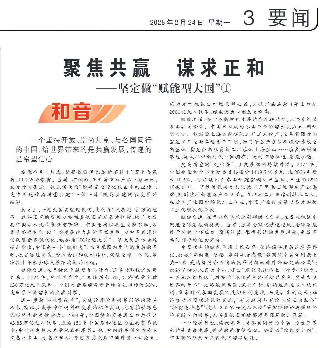 近期,《人民日報》“和音”欄目推出“堅定做‘賦能型大國’”系列評論,圍繞科技創(chuàng)新、開放共贏、綠色轉(zhuǎn)型、高質(zhì)量共建“一帶一路”、多邊治理等熱點議題,從不同角度闡釋中國何以成為一個“賦能型大國”的深層邏輯,展現(xiàn)中國始終秉持構(gòu)建人類命運共同體理念,不斷以中國式現(xiàn)代化為世界現(xiàn)代化賦能的大國擔當。