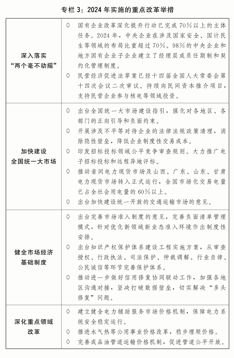 (二)進(jìn)一步全面深化改革,發(fā)展動力活力不斷增強。認(rèn)真落實黨的二十屆三中全會部署的重要改革舉措,深化經(jīng)濟(jì)體制改革,經(jīng)濟(jì)發(fā)展內(nèi)生動力、創(chuàng)新活力持續(xù)激發(fā)。