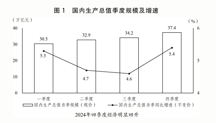 (一)因時因勢加強和創(chuàng)新宏觀調(diào)控,推動經(jīng)濟(jì)回升向好。扎實開展宏觀政策逆周期調(diào)節(jié),加大政策力度,釋放政策效能,特別是9月26日中央政治局會議果斷部署一攬子增量政策,市場預(yù)期、社會信心有效提振,四季度經(jīng)濟(jì)明顯回升。全年國內(nèi)生產(chǎn)總值(GDP)134.9萬億元、增長5%,其中,一、二、三產(chǎn)業(yè)分別增長3.5%、5.3%、5%。