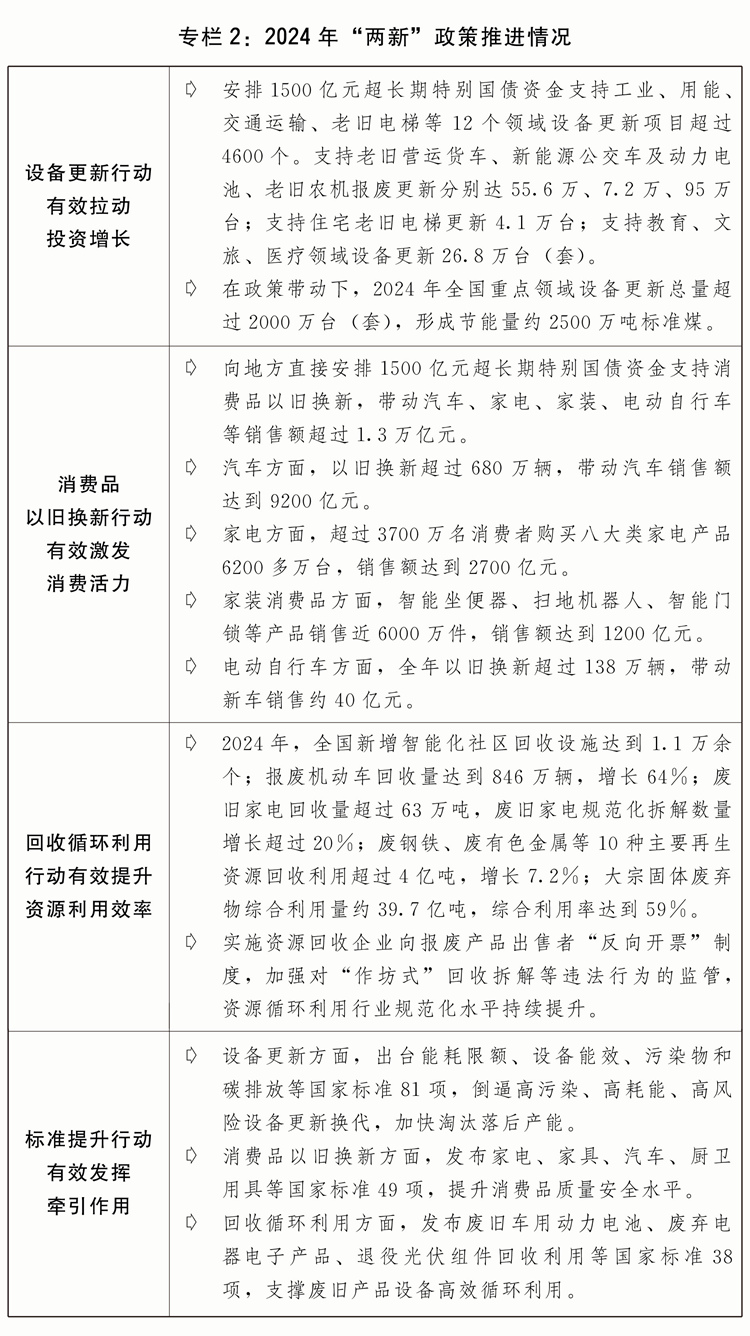 三是大規(guī)模設(shè)備更新和消費品以舊換新政策落地見效。印發(fā)“兩新”行動方案,出臺工業(yè)、建筑市政、交通、農(nóng)業(yè)、教育、文旅、醫(yī)療等七大領(lǐng)域設(shè)備更新實施方案和消費品以舊換新、回收循環(huán)利用、標(biāo)準(zhǔn)提升引領(lǐng)行動方案。安排3000億元超長期特別國債加力支持“兩新”工作。2024年,“兩新”政策帶動全國設(shè)備工器具購置投資增長15.7%,高于固定資產(chǎn)投資(不含農(nóng)戶)增速12.5個百分點;限額以上單位家用電器和音像器材類、家具類商品零售額分別增長12.3%、3.6%,帶動大宗耐用消費品銷售額超過1.3萬億元;消費品以舊換新活動中,新能源汽車銷量占比超過60%,一級能效家電銷售額占比超過90%。
