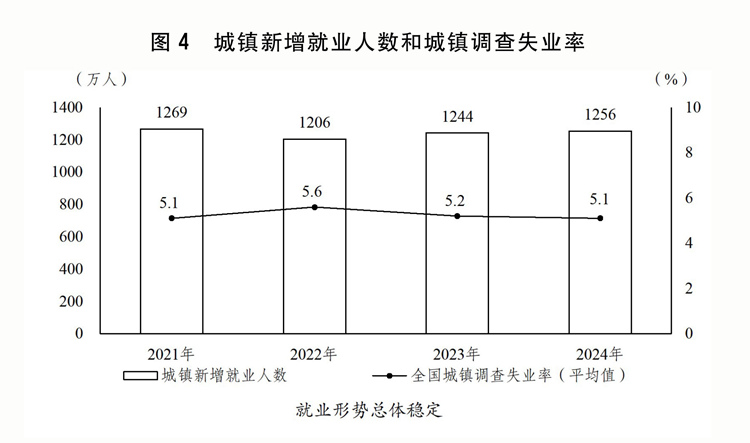 一是穩(wěn)就業(yè)促增收取得積極成效。出臺實施就業(yè)優(yōu)先戰(zhàn)略促進(jìn)高質(zhì)量充分就業(yè)的意見。延續(xù)實施失業(yè)保險援企穩(wěn)崗政策,優(yōu)化整合吸納就業(yè)補貼和擴(kuò)崗補助。強化高校畢業(yè)生、脫貧人口、農(nóng)民工以及就業(yè)困難人員等就業(yè)幫扶。實施高校畢業(yè)生等青年就業(yè)服務(wù)攻堅行動、先進(jìn)制造業(yè)促就業(yè)行動和百萬就業(yè)見習(xí)崗位募集計劃,構(gòu)建高校畢業(yè)生高質(zhì)量就業(yè)服務(wù)體系。加大力度支持公共實訓(xùn)基地建設(shè),持續(xù)做好重點人群技能培訓(xùn)。做好退役軍人就業(yè)服務(wù)保障,提高優(yōu)撫補助標(biāo)準(zhǔn)。城鎮(zhèn)新增就業(yè)1256萬人,城鎮(zhèn)調(diào)查失業(yè)率平均為5.1%。全國居民人均可支配收入實際增長5.1%。城鄉(xiāng)居民人均可支配收入比為2.34,城鄉(xiāng)居民收入相對差距繼續(xù)縮小。指導(dǎo)地方上調(diào)最低工資標(biāo)準(zhǔn)。向困難群眾發(fā)放一次性生活補助,惠及1100多萬人。