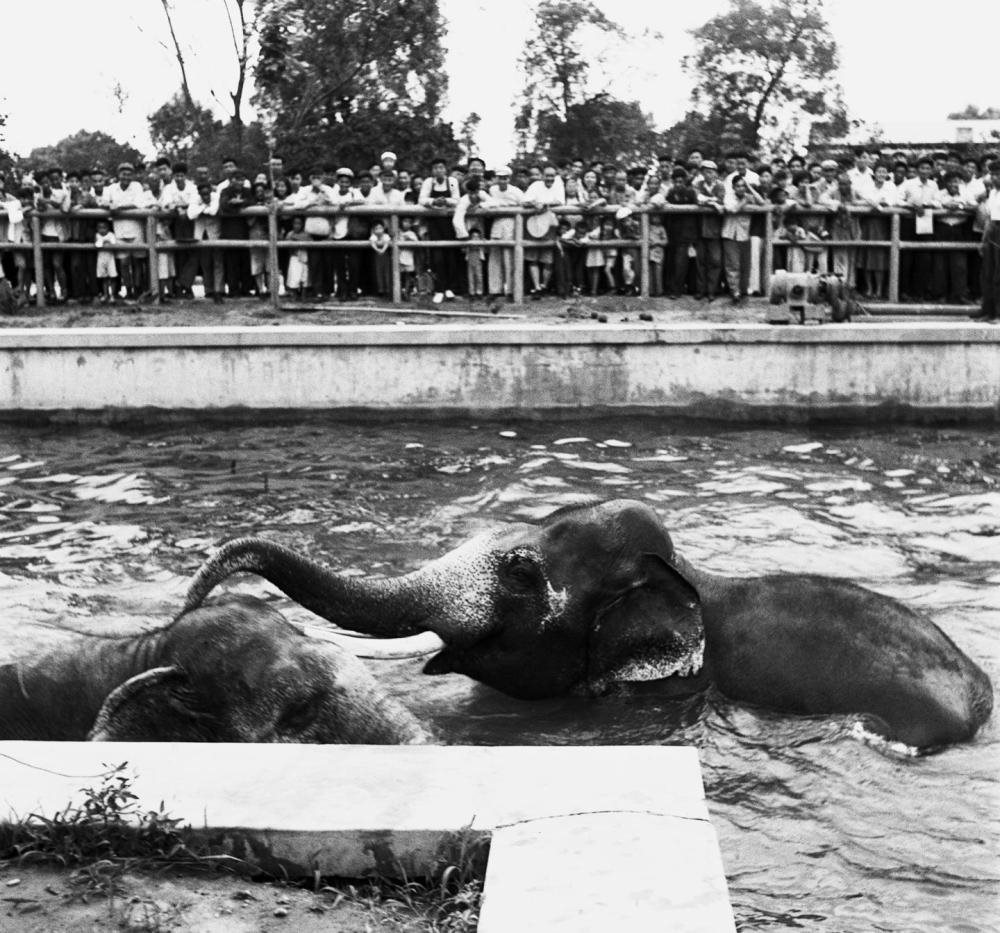 1954年7月,觀眾在北京西郊公園動(dòng)物園觀看越南等國(guó)家贈(zèng)送的大象。