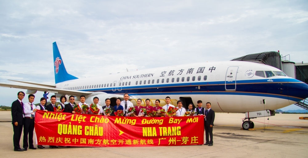 2015年6月20日,中國(guó)南航廣州至越南芽莊首航成功,機(jī)組人員在抵達(dá)越南金蘭國(guó)際機(jī)場(chǎng)后合影。